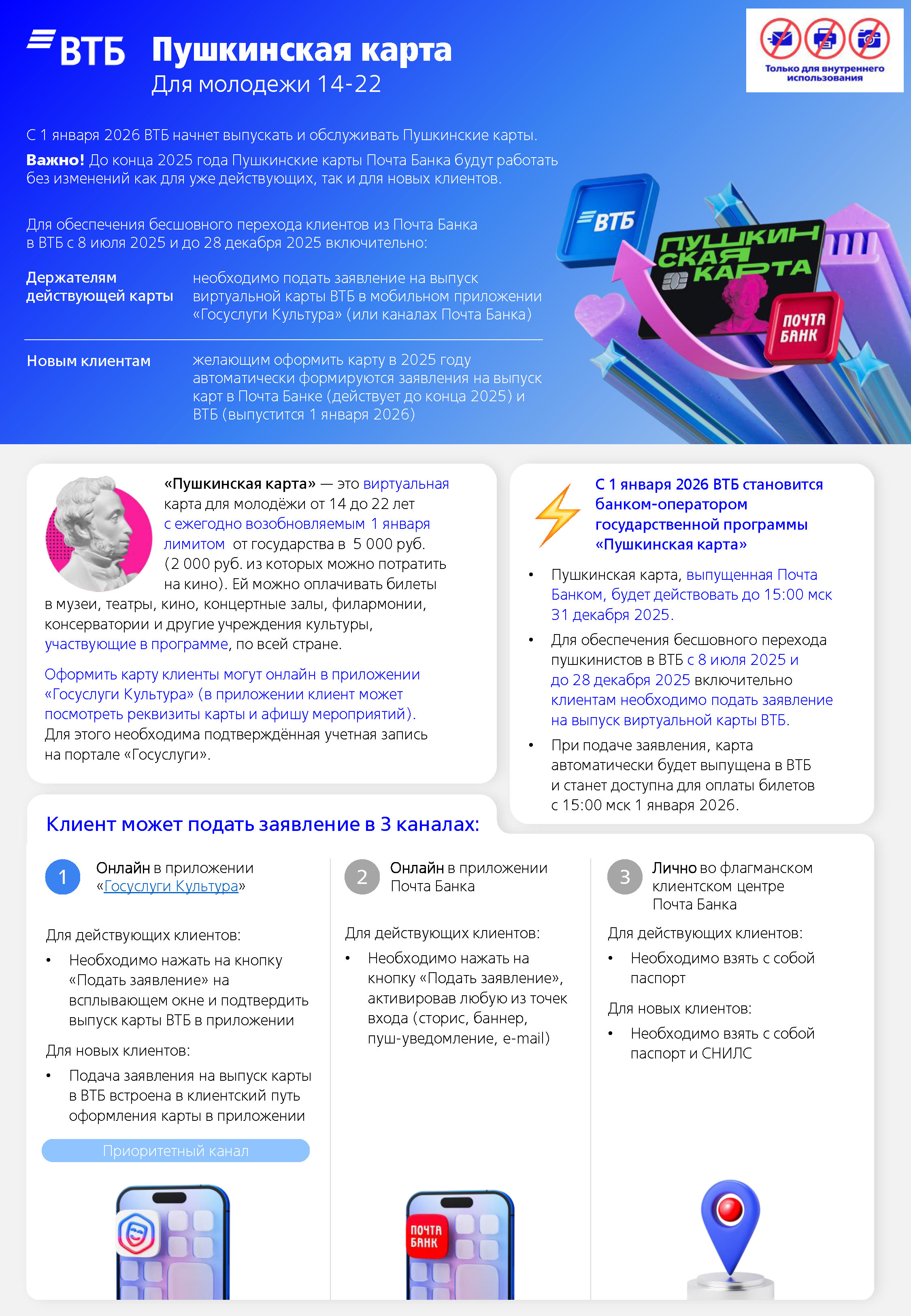 Пушкинская карта переезжает из Почта Банка в ВТБ.
